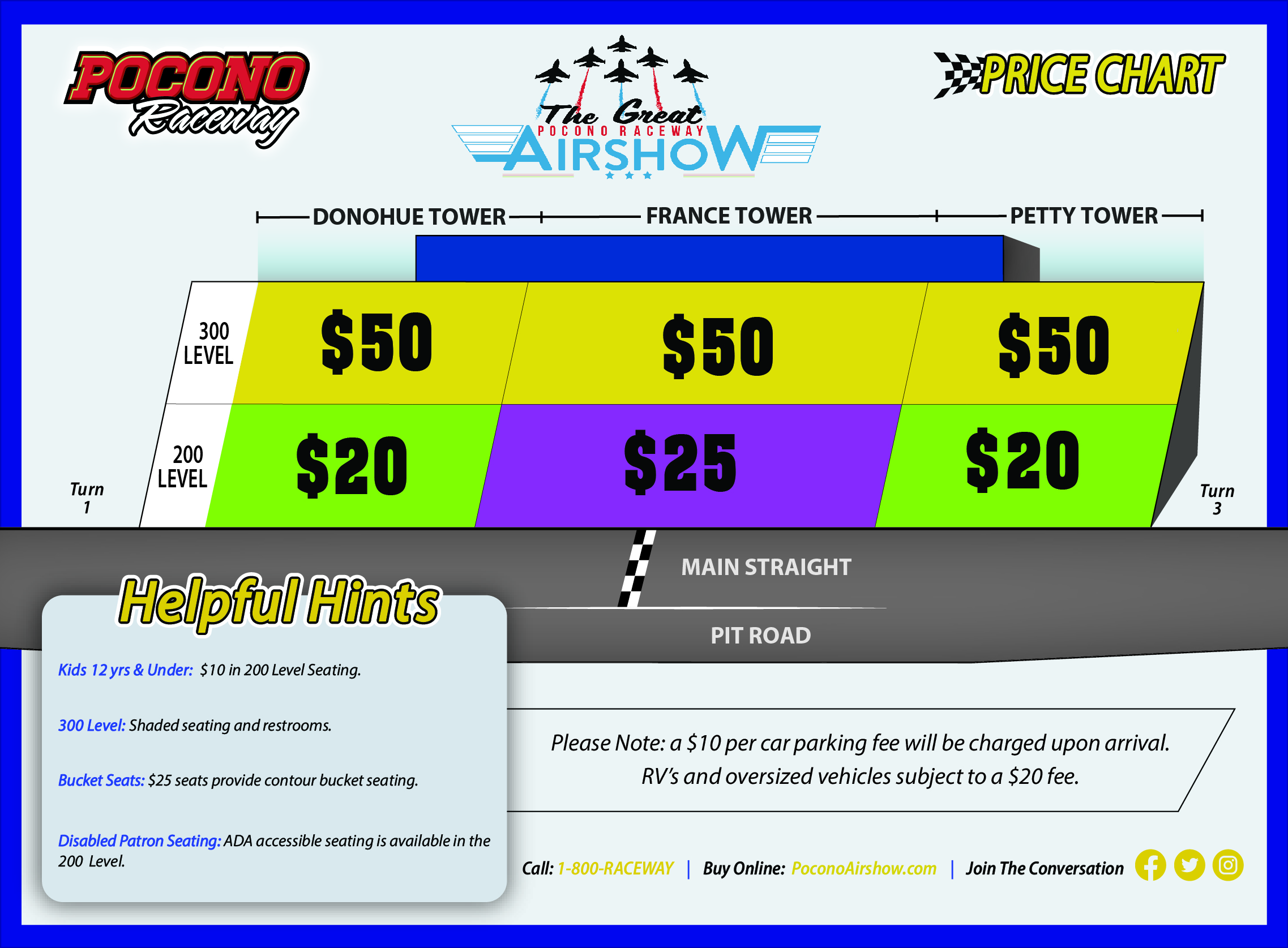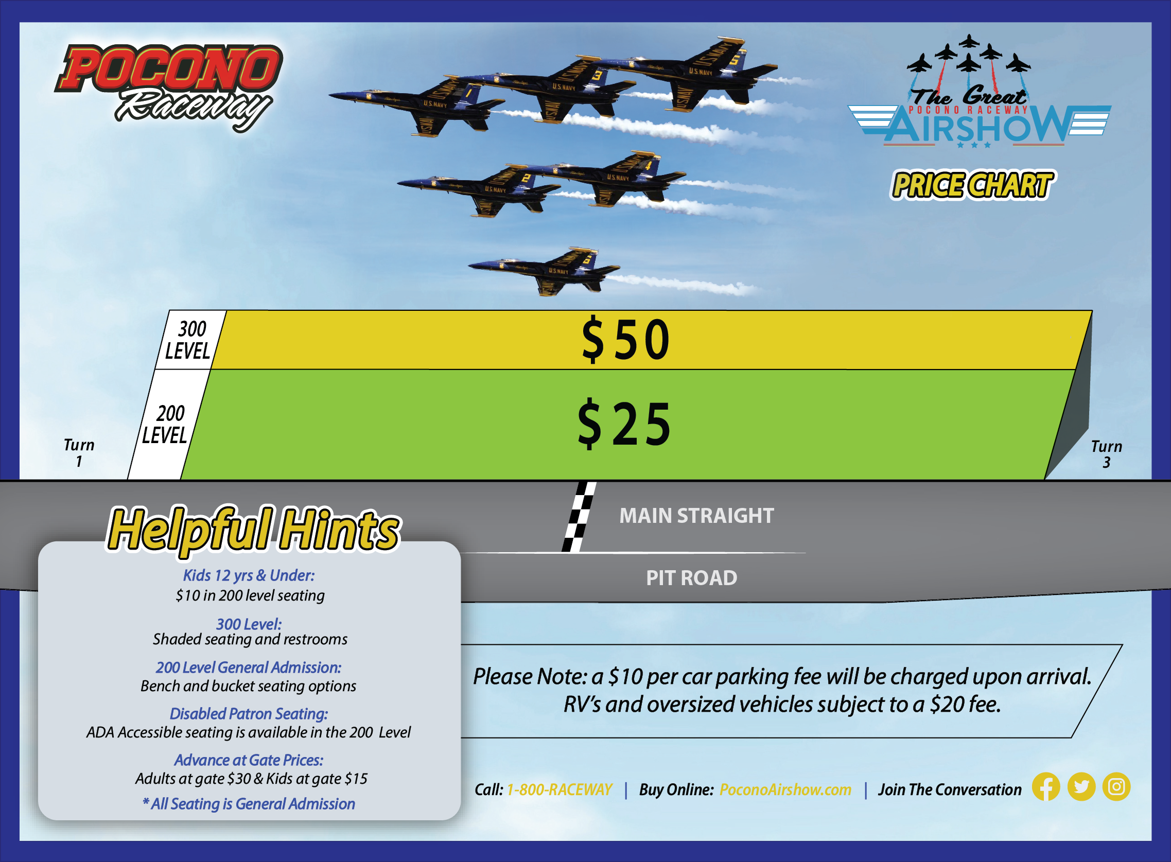 Great pocono raceway airshow events and ticket information. There is a $10 parking fee per car.